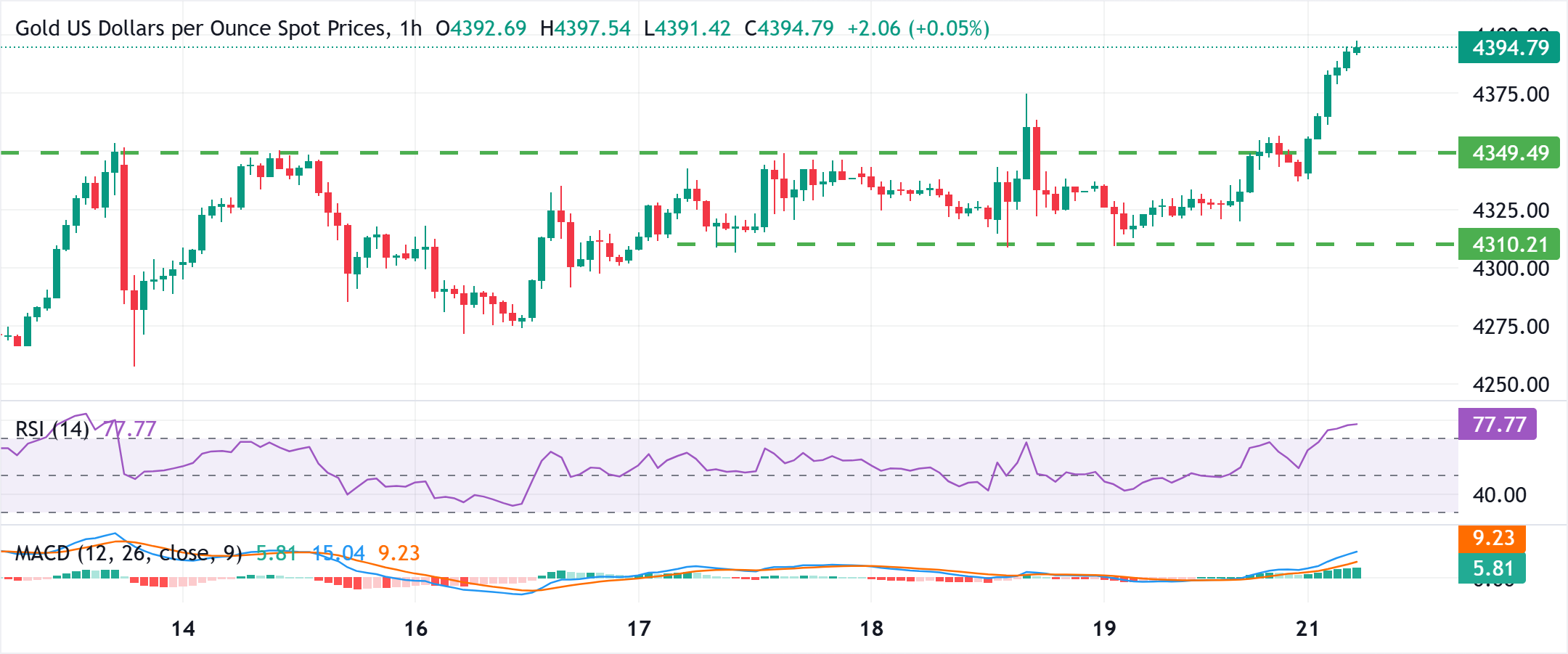Sementara itu, laporan Nonfarm Payrolls (NFP) AS yang beragam yang dirilis minggu lalu menunjukkan tanda-tanda pelemahan kondisi pasar tenaga kerja. Menambah hal ini, data inflasi konsumen AS yang lebih lemah pada hari Kamis lalu menguatkan spekulasi pasar pada pelonggaran kebijakan lebih lanjut oleh The Fed. Menurut FedWatch Tool dari CME Group, para pedagang saat ini memprakirakan dua penurunan suku bunga The Fed lagi pada tahun 2026. Hal ini, pada gilirannya, gagal membantu Dolar AS (USD) untuk membangun rebound baik minggu lalu dari level terendah sejak awal Oktober dan memberikan dorongan tambahan bagi harga Emas. Kenaikan kuat ini menarik stop trading jangka pendek yang ditempatkan di sekitar hambatan statis $4.345-4.350 di tengah volume perdagangan yang relatif tipis akibat musim liburan akhir tahun.