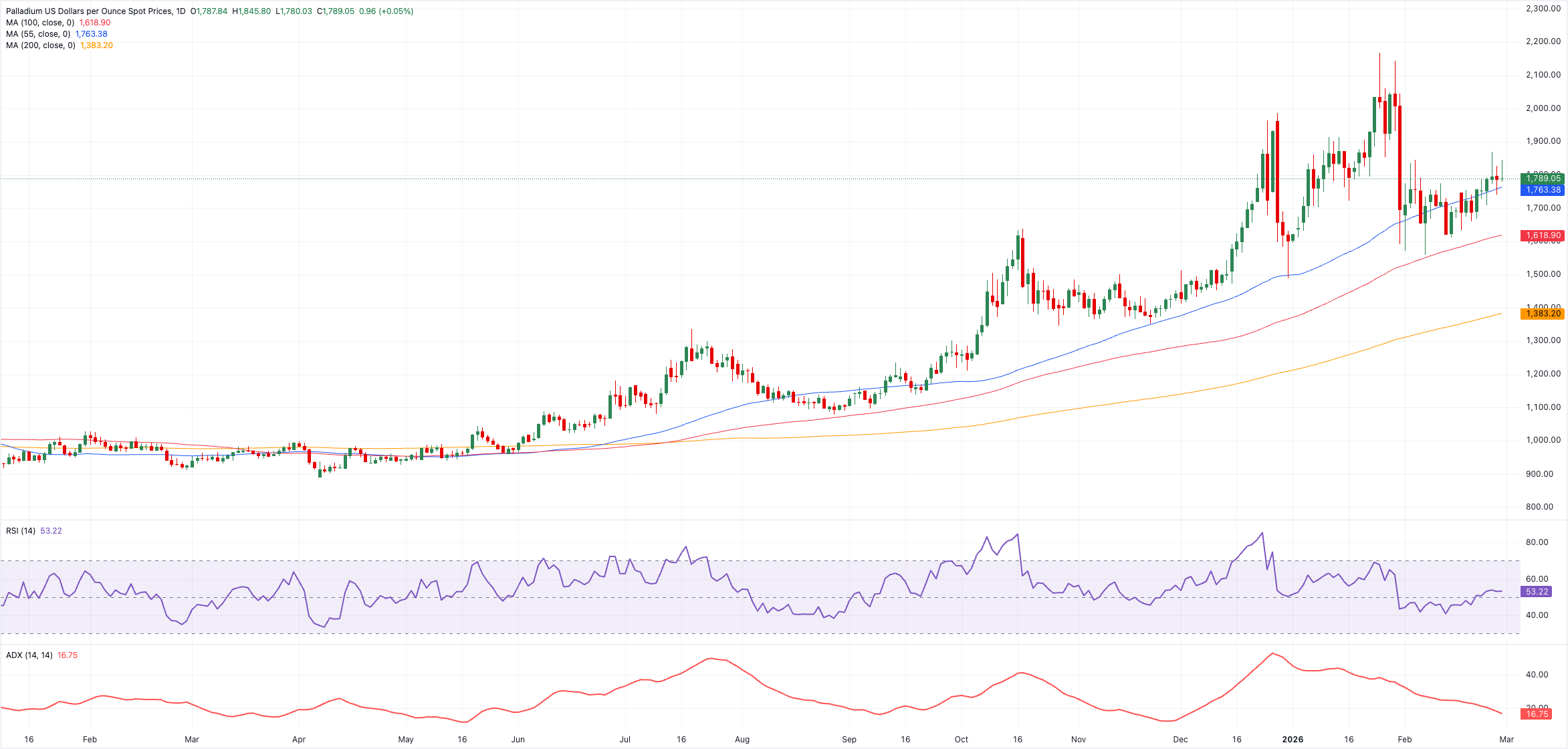 Setelah lonjakan besar, Palladium telah menetap dalam pola penahanan di sekitar area $1.750-$1.800 pada grafik harian. Pergerakan naik telah berhenti dengan cara yang cukup teratur alih-alih menjadi terlalu panas. Indikator momentum tetap berada di kisaran tengah, menunjukkan bahwa pasar mempertahankan keuntungannya daripada kehilangan momentum.