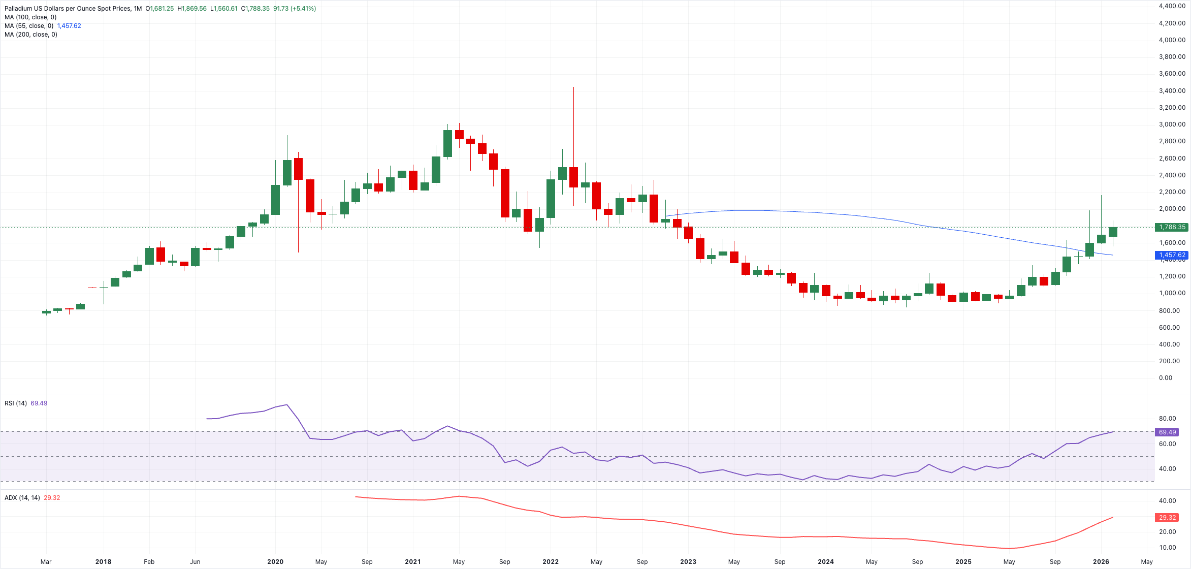 Palladium telah mengambil kembali moving averages jangka menengah dan panjang pada kerangka waktu mingguan dan bulanan. Higher lows telah mulai terbentuk. Momentum telah meningkat tanpa mencapai wilayah euforia.