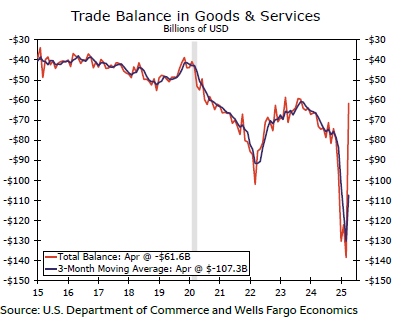 Penyempitan tajam defisit perdagangan internasional AS pada bulan April menunjukkan bahwa pemborosan sementara pada kuartal pertama yang dilakukan oleh perusahaan-perusahaan yang mendorong permintaan untuk menghindari tarif sudah berakhir. Defisit keseluruhan kini $76,7 miliar lebih kecil dibandingkan sebulan sebelumnya di bulan Maret ketika defisit melebar menjadi rekor $138,3 miliar (grafik). Pelebaran yang substansial dalam beberapa bulan terakhir mendefinisikan kuartal pertama di mana ekspor bersih mengurangi hampir lima poin persentase dari pertumbuhan PDB umum. Pembacaan awal Kuartal 2 ini memberi tahu kita untuk mengharapkan pembalikan besar.