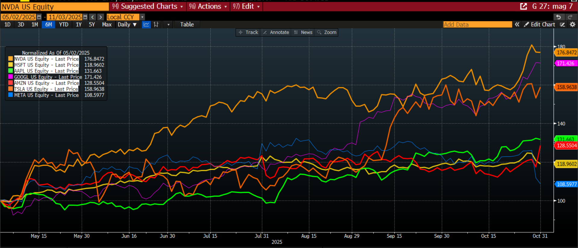 Bulan Oktober juga memberikan kita informasi berharga tentang sektor teknologi, yang telah menggerakkan rally di saham AS sejak April. Indeks semikonduktor Philadelphia naik hampir 10% pada bulan tersebut, mengungguli indeks yang lebih luas, dan merupakan sektor AS yang berkinerja terbaik. Laporan pendapatan untuk Kuartal III adalah campuran bagi teknologi besar, ada data pendapatan yang positif dari Amazon, Apple, dan Google, sementara hasil Microsoft dan Meta kurang diterima dengan baik.