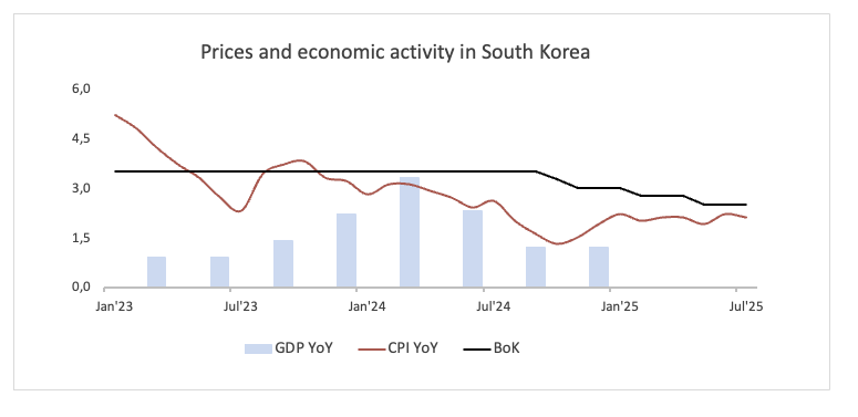 Bank sentral Korea Selatan mempertahankan suku bunga acuan tidak berubah di 2,50% pada 10 Juli, tetapi sebagian besar pengambil kebijakan memberikan sinyal bahwa pemotongan kemungkinan akan terjadi dalam tiga bulan ke depan karena ekonomi kesulitan di bawah beban tarif AS.