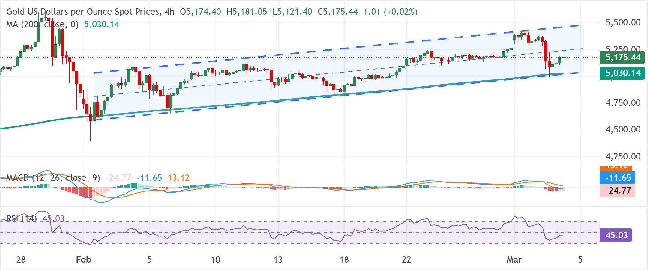 Emas berada dalam ascending channel paralel, melayang sedikit di atas batas bawah dekat $5.030, yang menjaga pola yang lebih luas tetap bullish meskipun pullback baru-baru ini dari area $5.380-$5.410. Selain itu, harga Emas masih diperdagangkan di atas Simple Moving Average (SMA) 200 periode yang miring ke atas pada grafik 4 jam, di sekitar $5.030, menjaga tren naik jangka menengah tetap utuh.