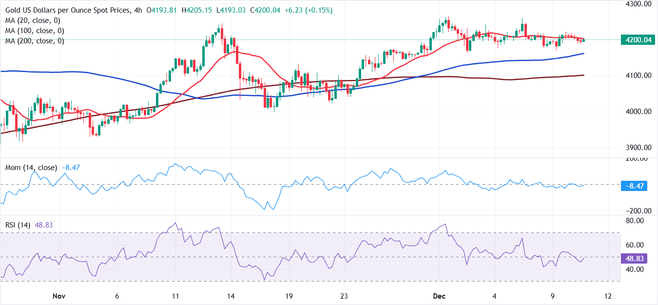 Dalam grafik 4-jam, XAU/USD diperdagangkan di $4.201,02, sedikit di bawah pembukaan harian. Simple Moving Average (SMA) 20 periode telah datar sedikit di atas level saat ini dan sedikit menurun. Pada saat yang sama, SMA 100 dan 200 periode terus naik jauh di bawah level saat ini, mempertahankan bias bullish jangka menengah. Support sejajar dengan SMA 100 periode di $4.161,04, sementara SMA 200 periode di $4.100,74 mendukung tren yang lebih luas. Sementara itu, indikator Momentum tetap di bawah 0 dan sedikit naik, sementara Relative Strength Index (RSI) berada di 49 (netral) dan berbalik naik, menunjukkan bahwa para penjual kehilangan tenaga.