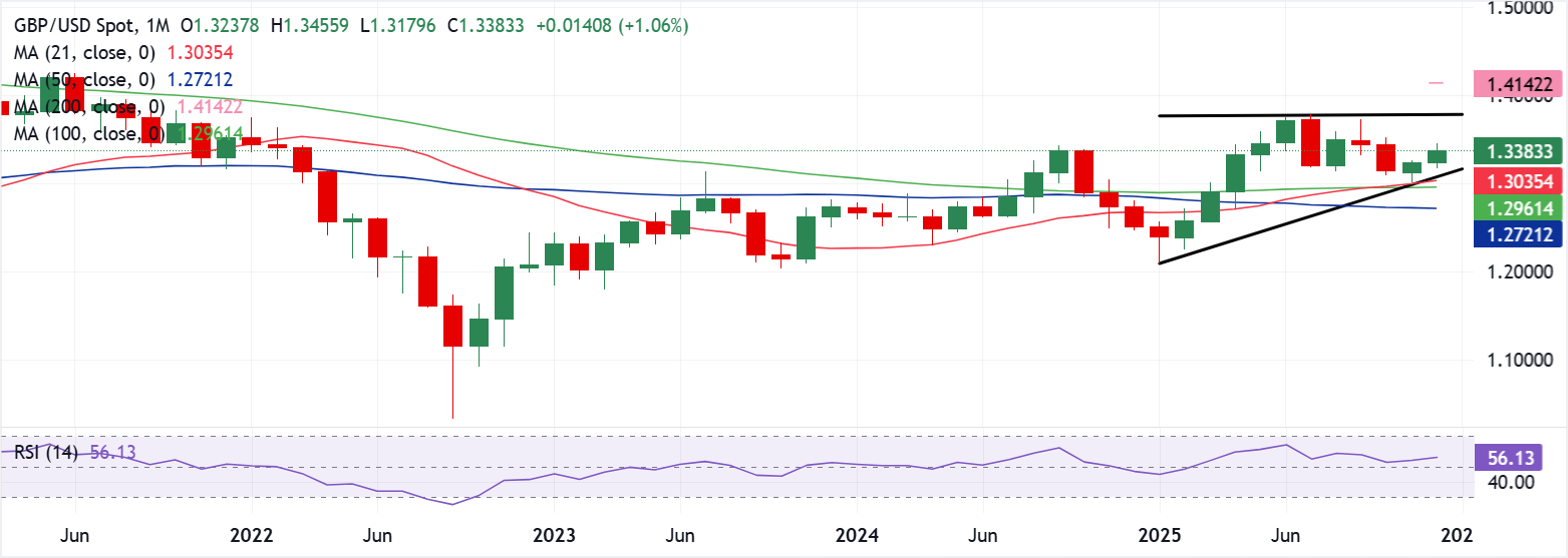 Di kuartal terakhir tahun ini, GBP/USD menemukan dukungan kuat di level psikologis 1,3000 saat USD kembali tertekan. Penutupan pemerintah AS terlama dalam sejarah, yang berlangsung selama 43 hari, menunda rilis data ekonomi, dan meningkatnya taruhan untuk penurunan suku bunga The Fed – untuk meredakan perlambatan pasar tenaga kerja – memicu kembali sisi negatif USD.