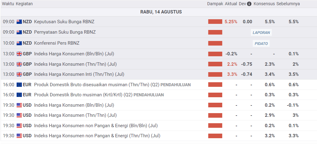 Untuk hari ini, Emas akan mengalami pergolakan yang sangat luar biasa imbas data Inflasi yang akan dikeluarkan pada pukul 19.30 WIB nanti. Melemahnya Dolar AS akan sangat menguntungkan bagi XAU/USD. Perlu di perhatikan bahwa pelemahan nilai IHK utama harus dilihat secara jelas karena diperkirakan akan mengalami penurunan dari 3,0% YoY ke 2,9% di bulan Juli. Sedangkan IHK Inti diperkirakan menyentuh level 3,2% jika dibandingkan sebesar 3,3% pada bulan lalu.