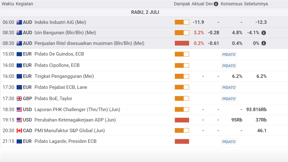 Fokus pasar pada hari ini masih akan tetap tertuju pada kebijakan yang diambil oleh Donald Trump serta potensi konflik geopolitik yang terjadi di Timur Tengah. Pasar menunggu rilis data ekonomi utama yang akan dikeluarkan pada minggu ini. Rilis data Perubahan Tenaga Kerja Non-Pertanian ADP (Jun) akan dikeluarkan pukul 19,15 WIB. Harap di perhatikan bahwa data yang dikeluarkan akan sangat mempengaruhi arah pergerakan pasar