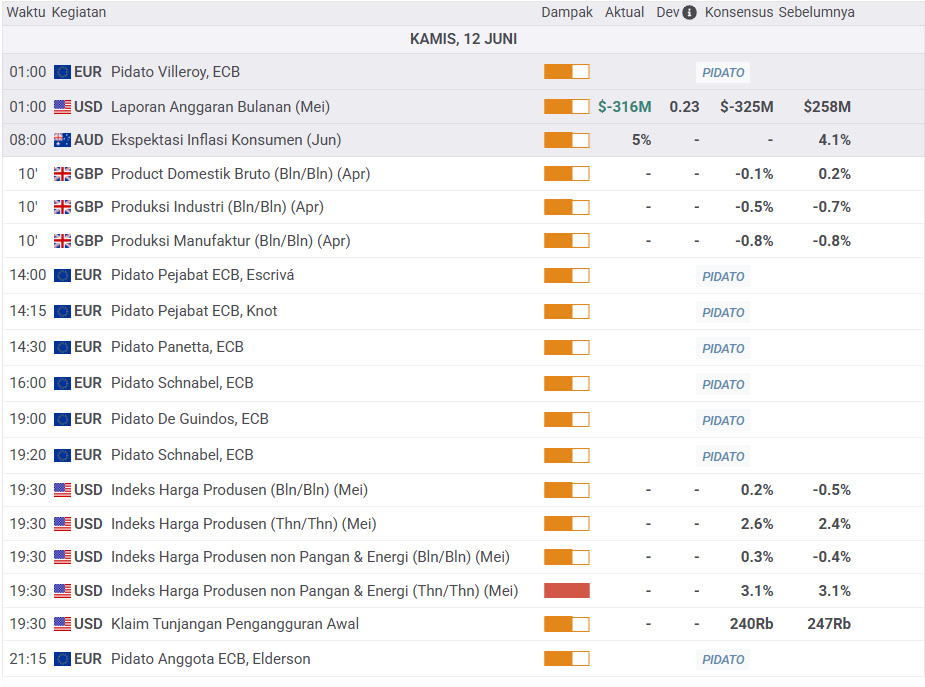 Fokus pasar pada hari ini masih akan tetap tertuju pada kebijakan yang diambil oleh Donald Trump pasca pemberlakuan tarif timbal balik serta permasalahan geopolitik yang semakin memanas di Timur Tengah. Sementara itu rilis data ekonomi utama akan dikeluarkan mala mini. Rilis Klaim Pengangguran Awal dan Indeks Harga Produsen (IHP) (MoM) (Mei) akan dikeluarkan pada pukul 19.30 WIB. Data yang akan dikeluarkan harap diperhatikan karena akan memberikan tekanan yang kuat bagi pergerakan pasar hari ini