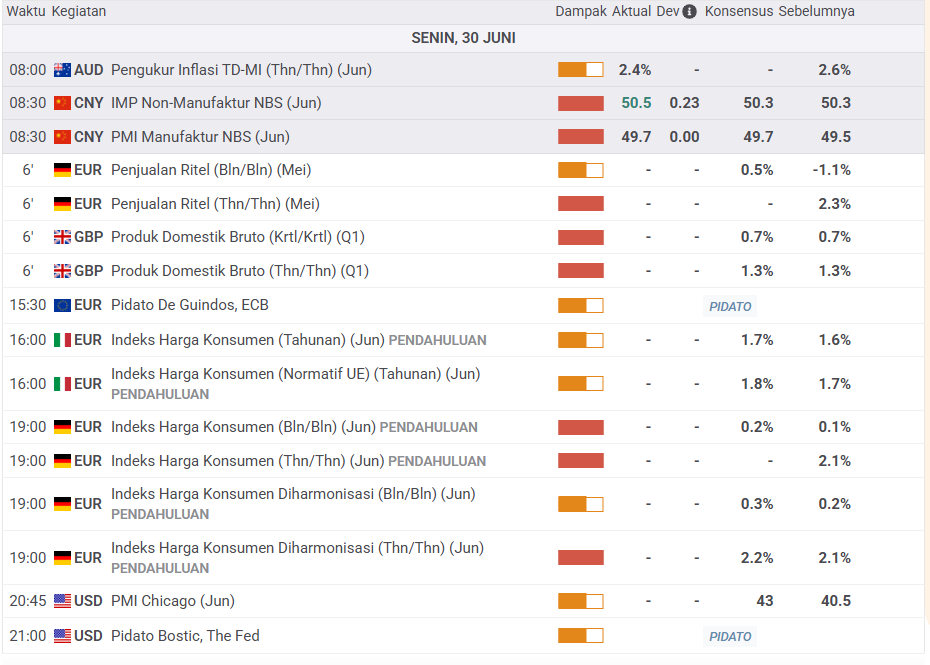 Sementara itu data fundamental utama yang dikeluarkan di hari jumat lalu, mencatat bahwa belanja pribadi AS bulan mei mengalami penurunan sebesar 0,1%. Disisi lain pendapatan Pribadi AS bulan mei juga mengalami penurunan sebesar 0,4%. Data Indeks Harga Belanja Konsumen Pribadi / PCE AS bulan mei mengalami kenaikan sebesar 2,3% YoY. Angka ini sesuai dengan prediksi yang dilakukan oleh pasar. Sedangkan data Indeks PCE Inti mengalami kenaikan sebesar 2,7% pada bulan mei.