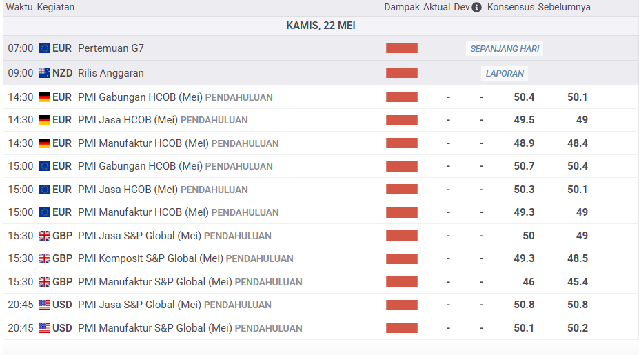 Fokus pasar pada hari ini masih akan tetap tertuju pada kebijakan yang diambil oleh Donald Trump pasca pemberlakuan tarif timbal balik. Rilis data ekonomi penting akan mewarnai pergerakan harian saat ini. Rilis data Klaim Pengangguran Awal akan dikeluarkan pada pukul 19.30 WIB. Sementara itu data Indeks Manajer Pembelian (PMI) Manufaktur dan Indeks Manajer Pembelian (PMI) Jasa bulan mei akan di rilis pukul 20.45 WIB dan disusul oleh rilis Penjualan Rumah Lama (Apr) pada pukul 21.00. Data ekonomi yang dikeluarkan harap diperhatikan karena akan sangat mempengaruhi arah pergerakan pasar.