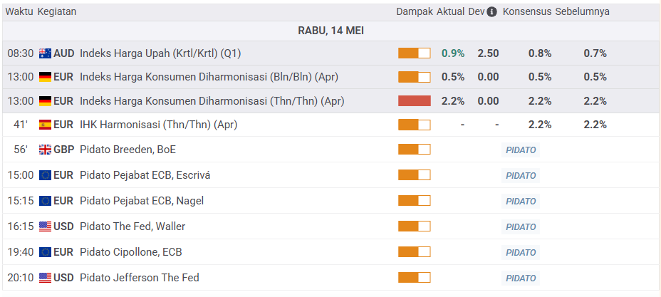 Data Indeks Harga Konsumen (IHK) bulan April mengalami penurunan dan berada sekitar 2,3% YoY dari 2,4% data sebelumnya. Sementara itu IHK Inti berada sesuai estimasi dan mengalami kenaikan menuju level 2,8%