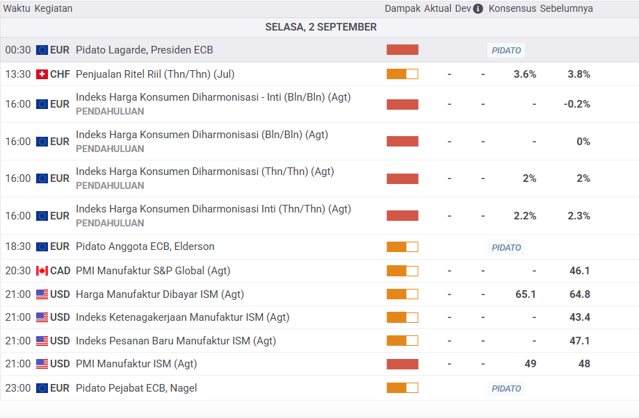 Fokus pasar pada hari ini akan tertuju pada permasalahan tarif serta dinamika yang terjadi pada The Fed. Harap diperhatikan rilis berita fundamental utama malam nanti. Rilis ndeks Manajer Pembelian (PMI) Manufaktur (Ags) pukul 20.45 WIB, kemudian disusul oleh rilis Indeks Manajer Pembelian (PMI) Manufaktur ISM (Ags) pukul 21.00 WIB. Rilis fundamental ekonomi ini diperkirakan akan memberikan dampak yang besar bagi pergerakan pasar hari ini.