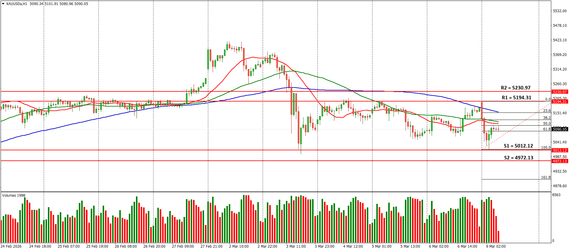 Pada pembukaan perdagangan hari ini, XAU/USD memulai sesi di level 5190.39, dan mengalami pelemahan hingga menembus level 5013.47 selama perdaganan asia. Akan tetapi rebound terjadi dan kembali menguat hingga menembus level 5090.05.