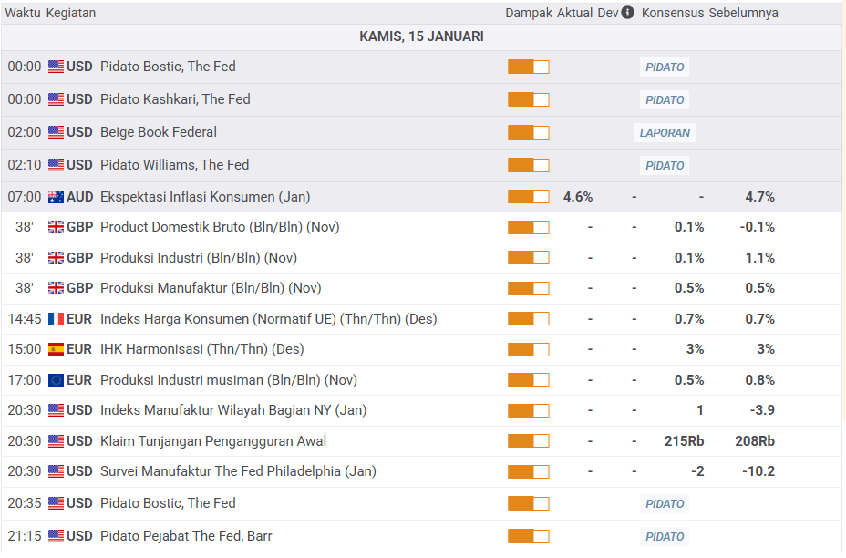 Fokus pasar hari ini akan tertuju pada sejumlah data ekonomi utama. Indeks Manufaktur Fed Philadelphia (Jan), data Klaim Pengangguran Awal pukul 20.30 WIB dan Indeks Manajer Pembelian (PMI) Manufaktur (Jan) pada pukul 20.45 WIB. Harap diperhatikan juga pernyataan yang akan dikeluarkan oleh pejabat The Fed, Raphael W. Bostic pada pukul 20.35 WIB dan Michael S. Barr pada pukul 21.15 WIB. Setiap pernyataan yang dikeluarkan pejabat The Fed akan sangat memberikan pengaruh bagi pergerakan pasar.