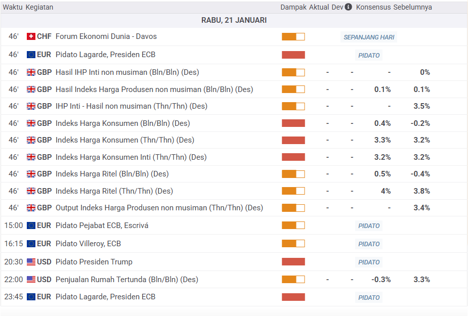 Pasar keuangan mengadopsi sikap hati-hati di tengah minggu saat para investor menunggu pidato Presiden AS Donald Trump di Forum Ekonomi Dunia di Davos, di mana ia diprakirakan akan mengomentari hubungan perdagangan UE-AS dan isu-isu terkait Greenland. Kalender ekonomi AS akan menampilkan data Penjualan Rumah Tertunda untuk bulan Desember.