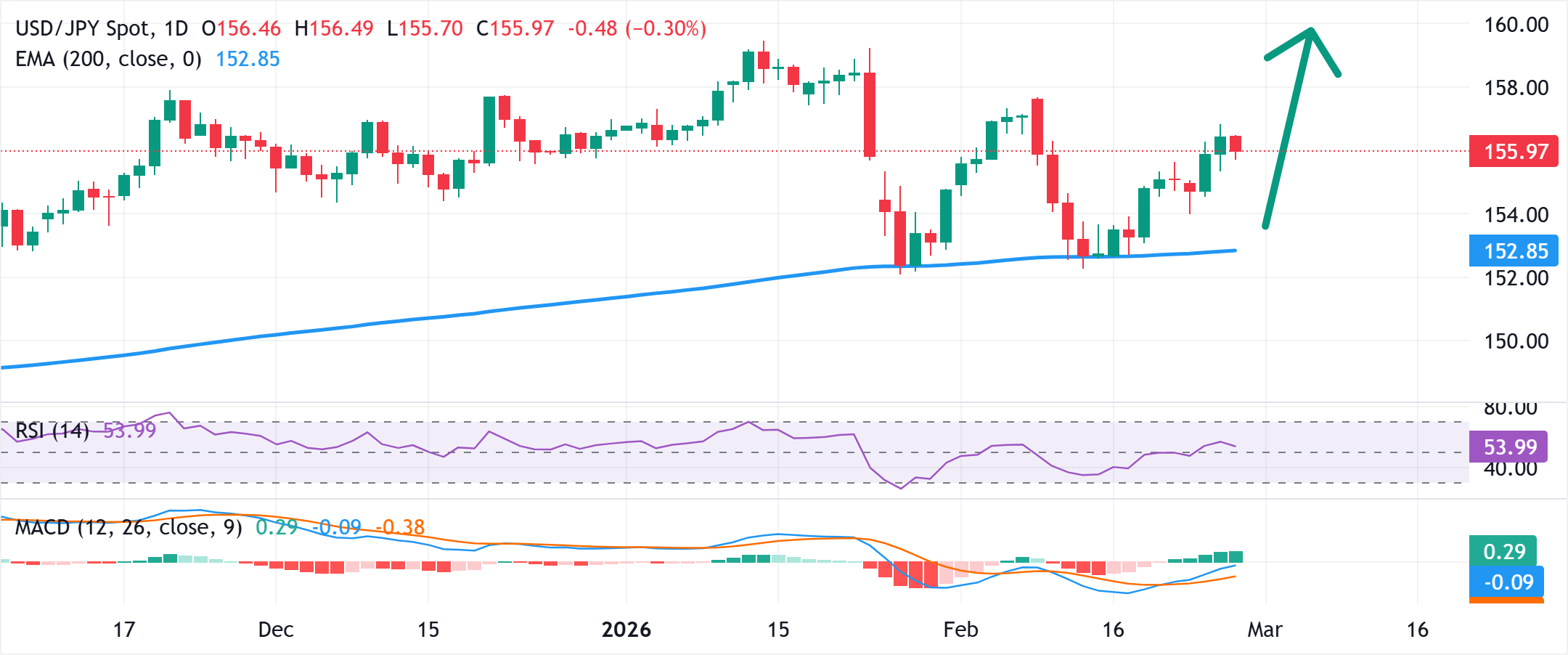 Rebound berulang baru-baru ini dari Exponential Moving Average (EMA) 200-hari yang secara teknis signifikan mendukung para pembeli USD/JPY. Ini menyiapkan jalan untuk pergerakan melampaui swing high terbaru, menuju pengujian level ambang intervensi di dekat level psikologis 160,00.