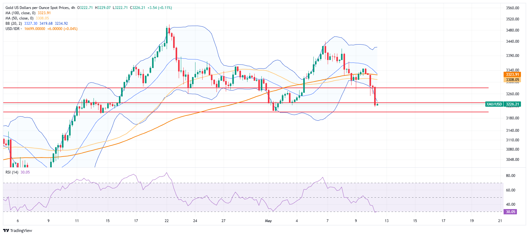 Saat ini harga emas berada di sekitar 3226 dan telah menembus ke bawah lower band dari Bollinger Bands, menandakan kondisi jenuh jual (oversold) yang bisa memicu koreksi jangka pendek. RSI berada pada level 30.05, yang juga mendekati atau menyentuh wilayah jenuh jual.