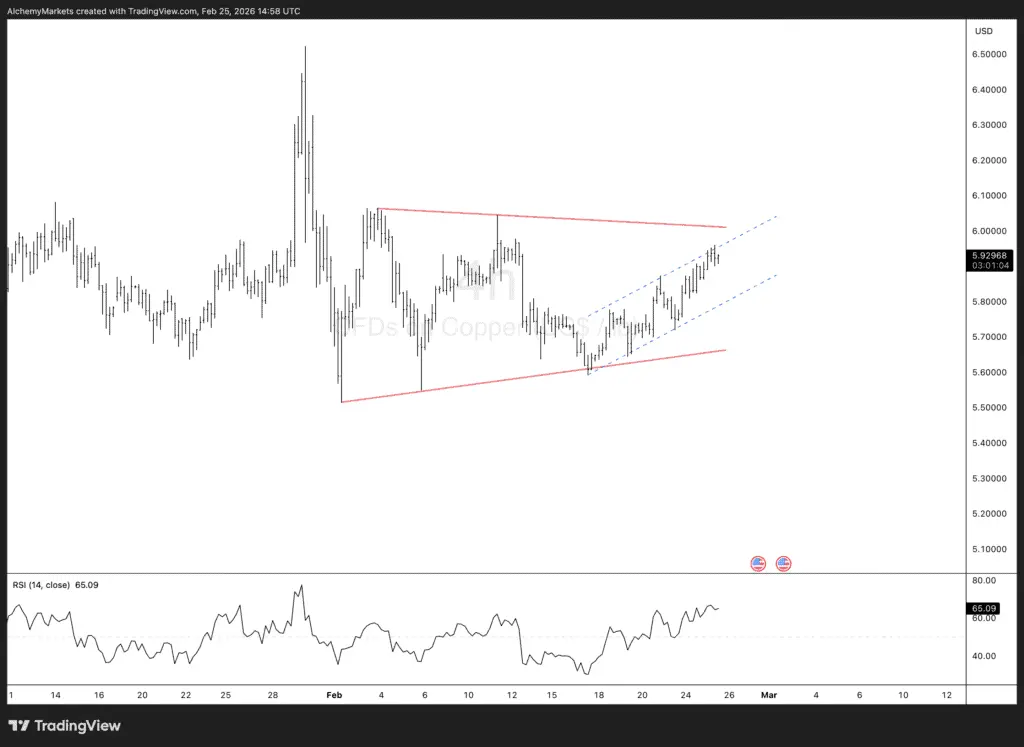 Hari ini Grafik Tembaga Hari Ini menyoroti pasar yang berada di titik infleksi. Setelah impuls tajam di bulan Januari hingga awal Februari, tembaga telah bertransisi dari ekspansi ke kompresi. Harga kini menekan batas atas dari segitiga jangka menengah — tetapi struktur internal menunjukkan bahwa pergerakan ini mungkin bersifat korektif daripada impulsif.