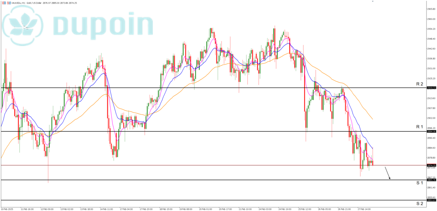 Berdasarkan dari kombinasi candlestick dan indikator Moving Average yang terbentuk saat ini menunjukan bahwa Trend Bearish masih menguat pada XAU/USD. Lalu proyeksi hari ini XAU/USD berpotensi turun sampai dengan 2865 namun jika harga turun dan Rebound maka kenaikannya bisa sampai dengan 2894 untuk target terdekatnya.