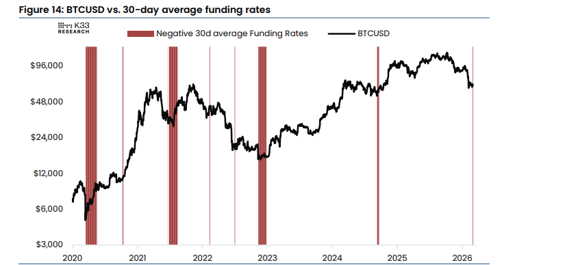 - K33 menyatakan bahwa BTC sangat oversold, mengutip suku bunga pendanaan negatif yang jarang dan arus masuk ETF yang kuat sebagai tanda pemulihan.