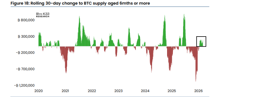 Data tambahan mengindikasikan bahwa para pemegang Bitcoin besar telah mengurangi tekanan jual. Selama sebulan terakhir, pasokan BTC yang berusia enam bulan atau lebih telah meningkat, membalikkan kontraksi tajam yang tercatat pada Kuartal IV tahun 2025.