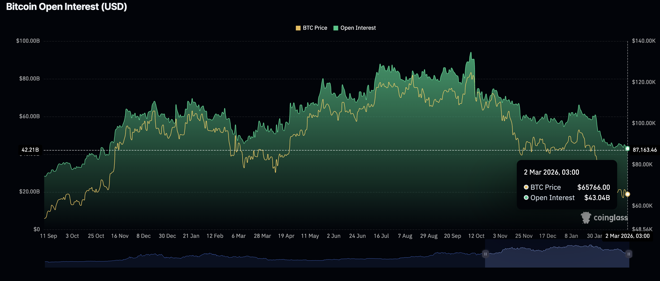 Para investor sedang menavigasi volatilitas tinggi dan ketidakpastian geopolitik serta makroekonomi, yang umumnya tidak menguntungkan bagi kripto. Open Interest (OI) berjangka Bitcoin jatuh menjadi $43 miliar pada hari Senin dari $44 miliar pada hari sebelumnya. Ini adalah level terendah OI sejak November 2024, menegaskan menurunnya minat investor ritel, yang mencapai puncaknya sekitar $94 miliar pada bulan Oktober.