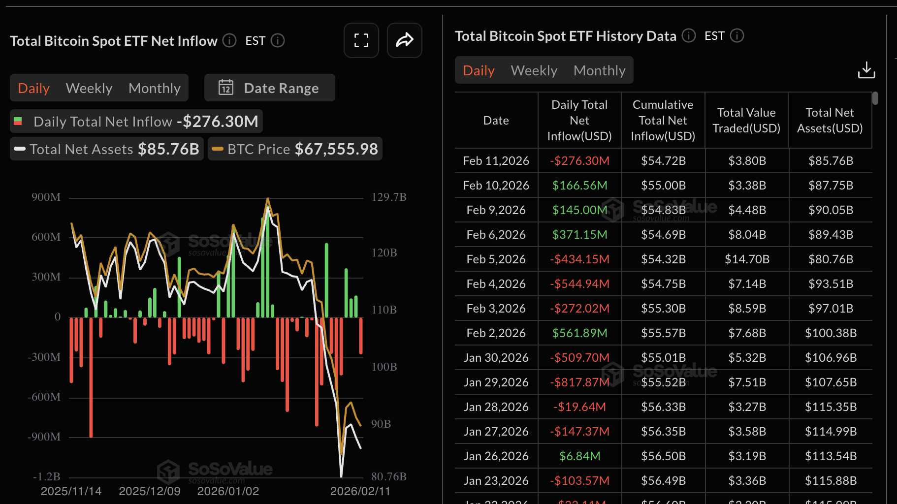 Menurut data SoSoValue, investor menarik sekitar $276 juta dari Bitcoin spot Exchange-Traded Funds (ETFs) pada hari Rabu, memutus tiga hari berturut-turut arus masuk. Arus masuk kumulatif mencapai $54,72 miliar, dan aset bersih mencapai $85,76 miliar.