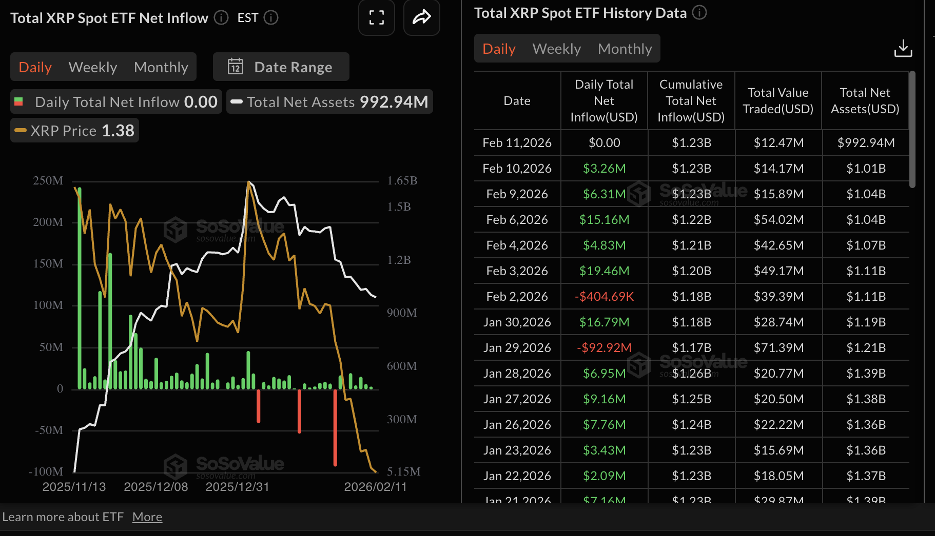 XRP spot ETFs, di sisi lain, tetap sepi, dengan nol arus pada hari Kamis, meninggalkan arus masuk kumulatif di $1,23 miliar dan aset bersih yang dikelola sekitar $993 juta. Sebelumnya, ETF tersebut telah mempertahankan lima hari berturut-turut arus masuk.