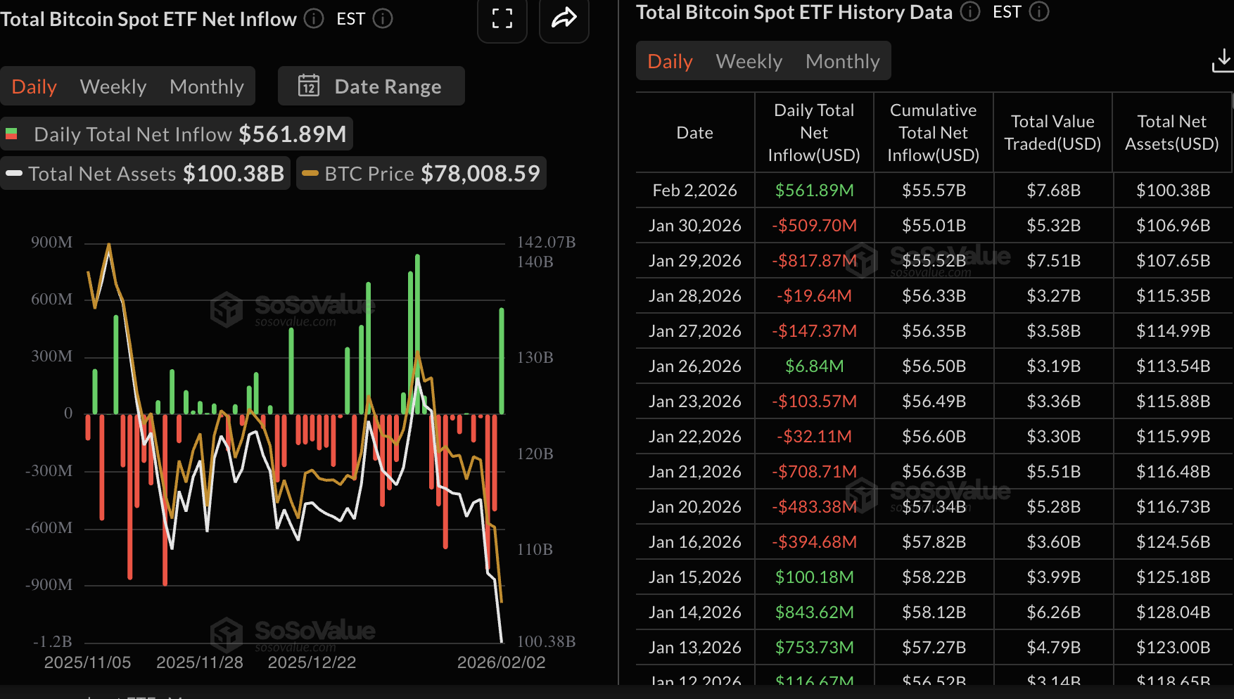 ETF spot Bitcoin yang terdaftar di AS melihat arus masuk hampir $562 juta pada hari Senin. Ini menandai kembalinya minat institusional, memutus rentetan arus keluar selama empat hari yang telah merugikan kinerja harga Bitcoin.