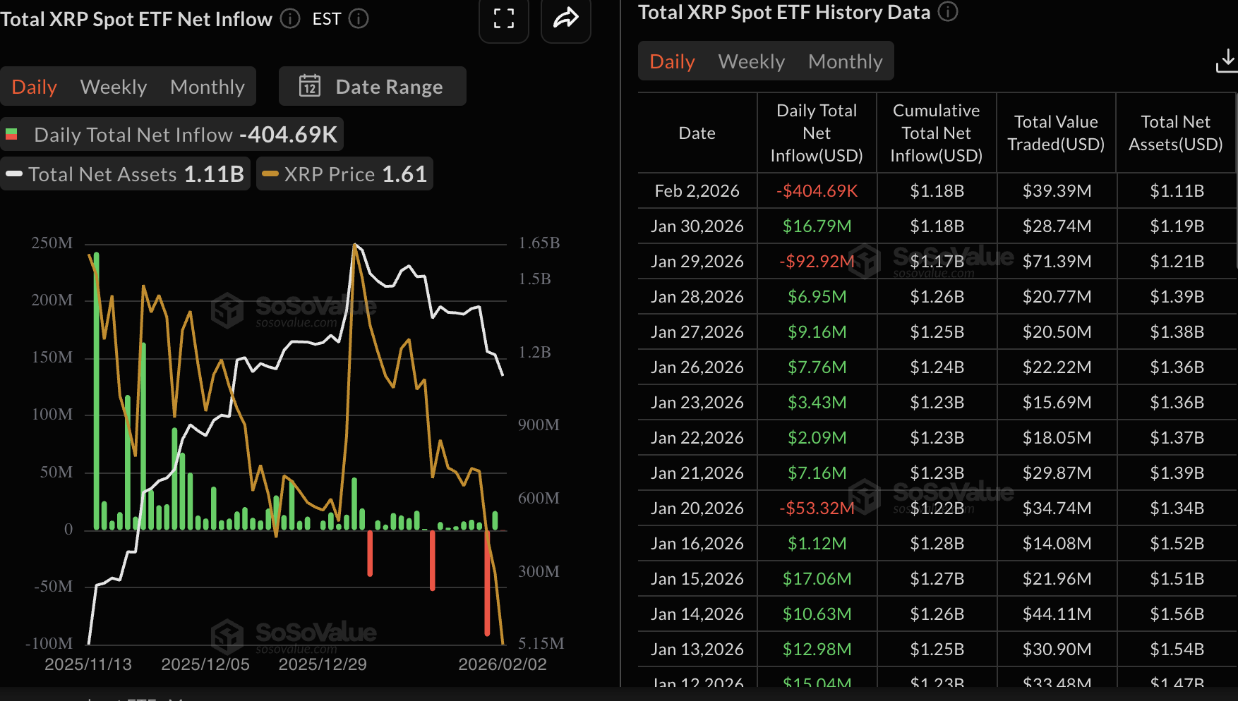 Sementara itu, ETF XRP mencatat arus keluar ringan sekitar $405.000 pada hari Senin, setelah mencatat arus masuk signifikan hampir $17 juta pada hari Jumat. ETF XRP memiliki total kumulatif $1,18 miliar, sementara total aset bersih yang dikelola mencapai $1,11 miliar, menurut data SoSoValue.