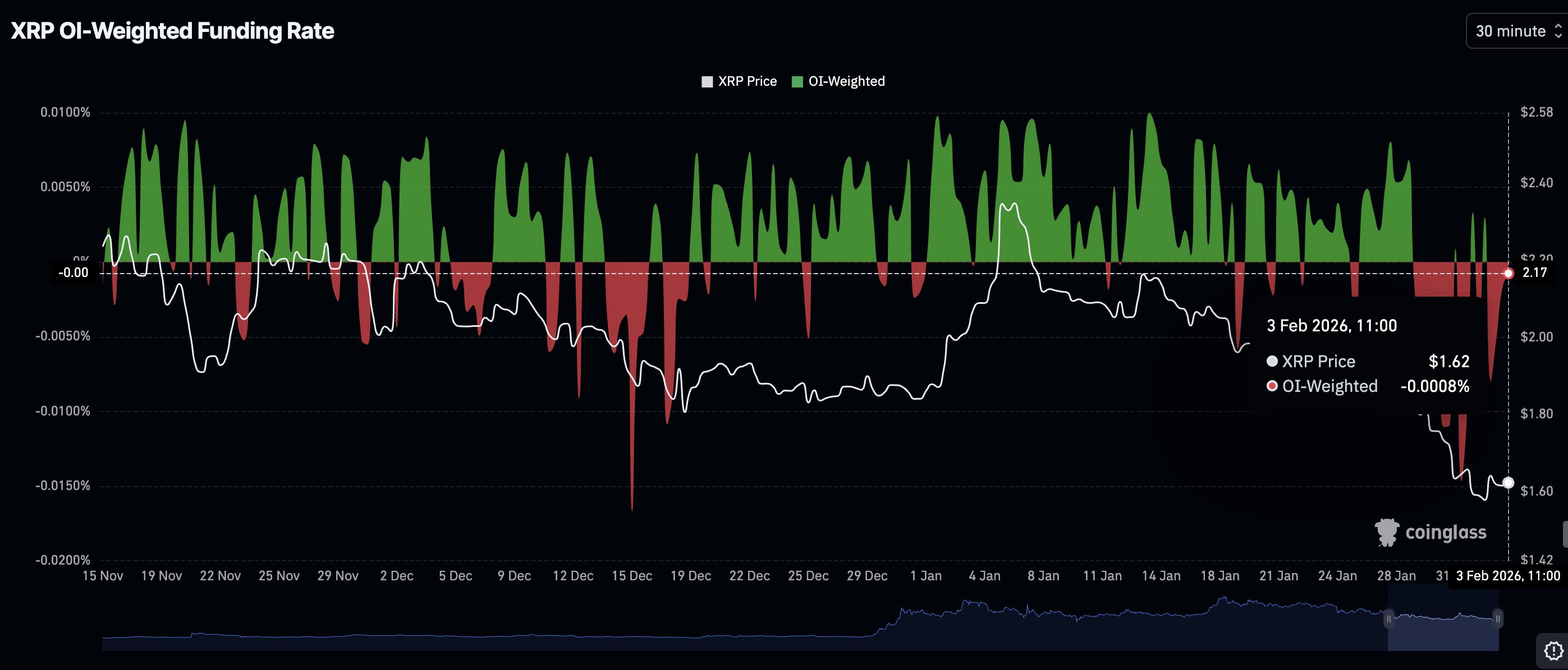 Pasar ritel tetap berhati-hati, dengan para pedagang menutup posisi daripada membuka yang baru. Data CoinGlass menunjukkan bahwa Open Interest (OI) XRP Weighted Funding Rate masih negatif di -0,0008% pada hari Selasa, naik dari -0,0080% pada hari sebelumnya.