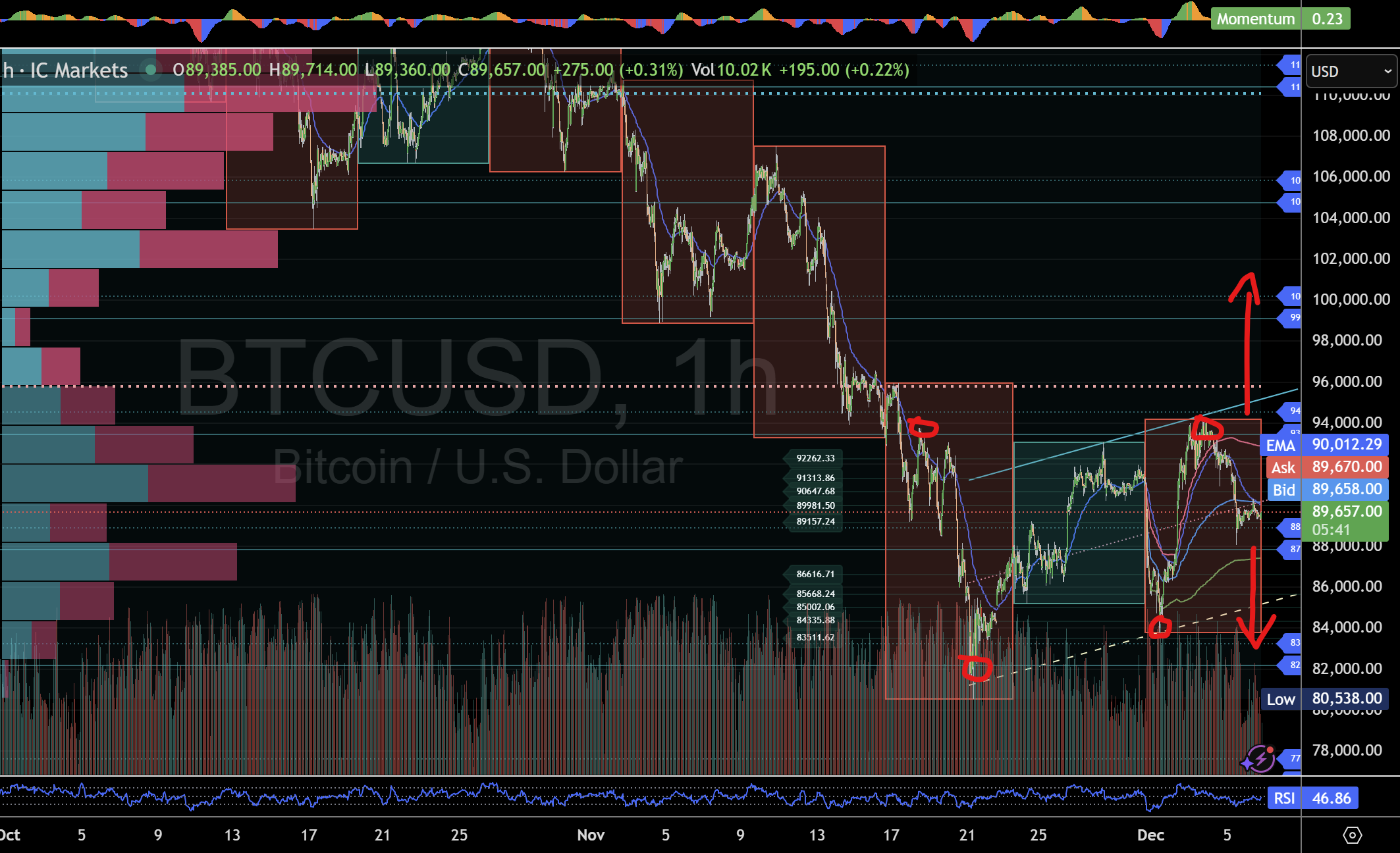 Pada saat pembaruan sebelumnya, Bitcoin diperdagangkan di dekat 93.300. Hingga 7 Desember, BTC diperdagangkan di sekitar 88.900, turun sekitar $4.400 — sebuah pergerakan yang sepenuhnya sejalan dengan pullback yang diharapkan dari pivot dalam perdagangan harian atas.