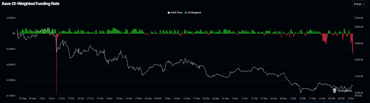 Di sisi derivatif, data suku bunga pendanaan CoinGlass memproyeksikan prospek bearish untuk AAVE. Metrik ini beralih ke suku bunga negatif pada hari Senin dan berada di -0,040% pada hari Selasa, level terendah sejak 11 Oktober dan mendekati level-level yang terlihat selama penurunan pasar pada 10 Oktober. Suku bunga negatif ini mengindikasikan bahwa posisi short membayar posisi long, yang mengindikasikan sentimen bearish menuju AAVE.