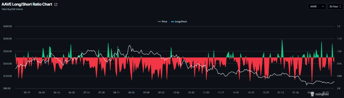 Selain itu, rasio long-to-short Aave di 0,97 pada hari Selasa. Rasio di bawah 1 ini mengindikasikan sentimen bearish karena para pedagang bertaruh pada penurunan harga Aave.