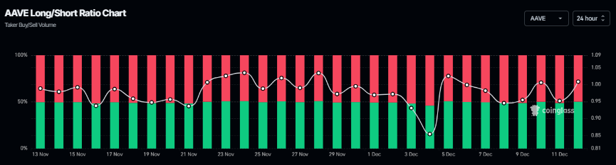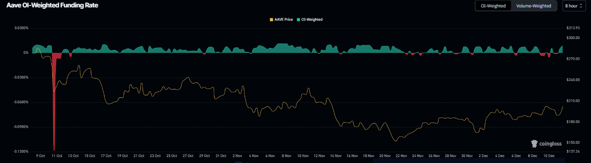 Di sisi derivatif, data tingkat pendanaan Aave juga mendukung tanda-tanda rally. Menurut data Tingkat Pendanaan Tertimbang OI dari Coinglass, jumlah pedagang yang bertaruh bahwa harga Aave akan turun lebih lanjut lebih sedikit dibandingkan dengan mereka yang mengantisipasi kenaikan harga.