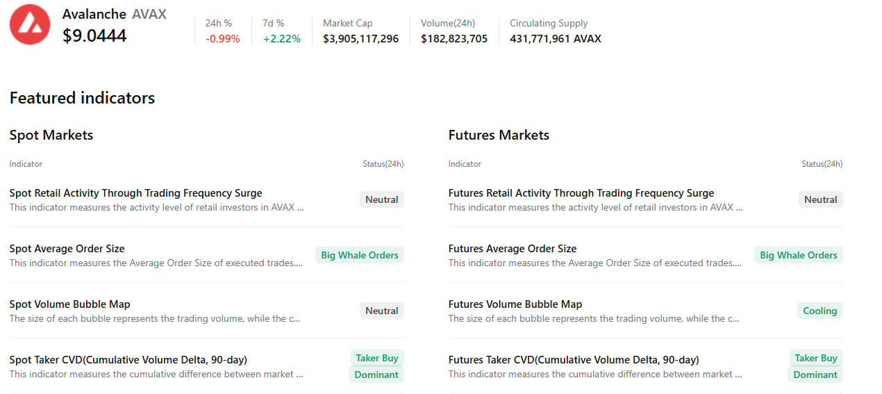 Data ringkasan CryptoQuant menunjukkan tanda-tanda awal bullish, dengan pesanan whale besar, kondisi yang mendingin, dan dominasi sisi beli di seluruh pasar spot dan berjangka. Semua faktor ini mendukung potensi pemulihan harga untuk Avalanche.