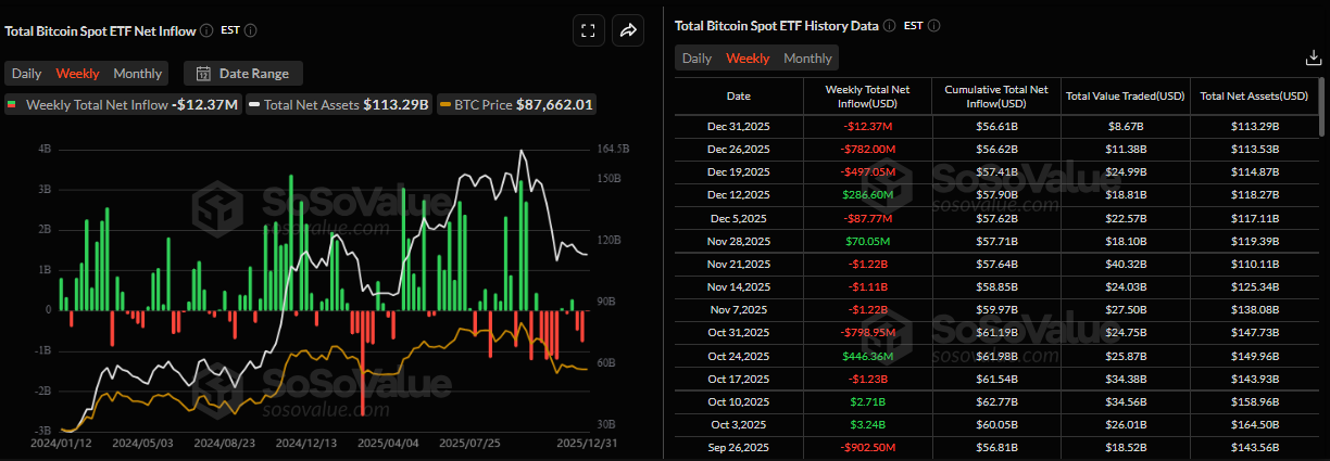 Harga Bitcoin (BTC) diperdagangkan di sekitar $89.000 pada hari Jumat, melanjutkan aksi harga sideways-nya selama hampir tiga minggu saat para pelaku pasar tetap ragu. Permintaan institusional terus melemah, dengan Exchange Traded Funds (ETF) Bitcoin mencatatkan arus keluar bersih ringan untuk minggu ketiga berturut-turut. Sementara itu, kondisi likuiditas akhir tahun yang mereda telah membantu menstabilkan sentimen risiko yang lebih luas, menjaga BTC tetap terkurung dalam kisaran perdagangan yang sempit untuk saat ini.