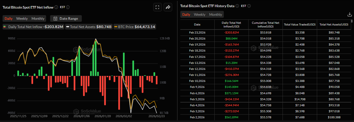 Permintaan institusional Bitcoin gagal mendukung penurunan harga, dengan mata uang kripto (cryptocurrency) terbesar berdasarkan kapitalisasi pasar terus mengalami penarikan, jatuh ke level terendah dua minggu di $62.700 pada hari Selasa. Data SoSoValue menunjukkan bahwa ETF Bitcoin yang diperdagangkan di bursa (ETFs) mencatat arus keluar sebesar $203,82 juta pada hari Senin, setelah lima minggu berturut-turut arus keluar sejak akhir Januari. Jika tren ini berlanjut, BTC dapat melihat koreksi lebih lanjut.