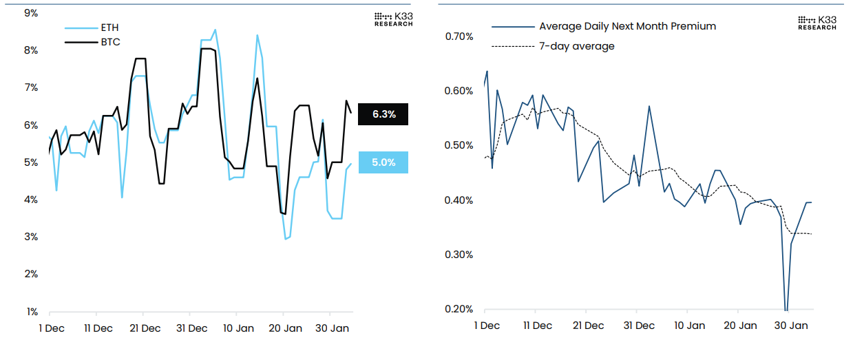 Grafik (kiri) di bawah menunjukkan bahwa premi kontrak berjangka BTC yang terannualisasi stabil di 6,3% pada hari Selasa, konsisten dengan premi yang diamati selama tiga bulan terakhir, menandakan bahwa para pedagang tetap sebagian besar tidak aktif di tengah lingkungan yang berisiko. Selain itu, meskipun premi berjangka telah stabil, struktur jangka waktu terus menurun, dengan rata-rata premi bulan depan CME selama 7 hari (grafik kanan) saat ini berada di level terendah yang belum terlihat sejak krisis perbankan AS pada Maret 2023, menunjukkan keengganan yang besar untuk menambah risiko kalender.