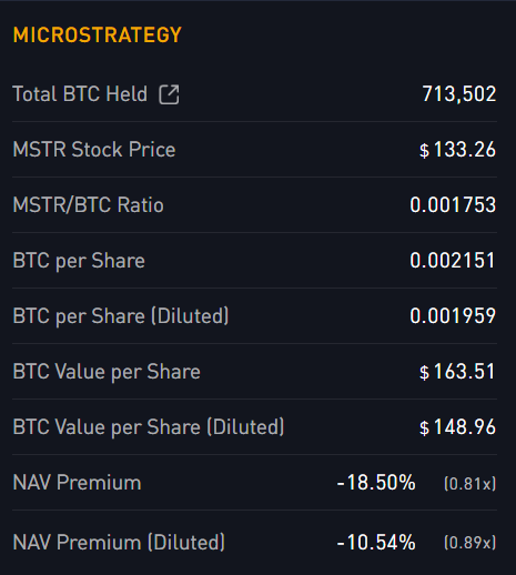Sementara itu, metrik premium NAV saat ini, yang mengukur seberapa banyak pasar menghargai perusahaan relatif terhadap nilai bersih kepemilikan Bitcoin dan aset lainnya, tidak termasuk kewajiban, menunjukkan -18,50% (0,81x), yang menunjukkan bahwa pasar menghargai MSTR pada 81% dari nilai kepemilikan Bitcoin per saham (tidak termasuk nilai bisnis lainnya).