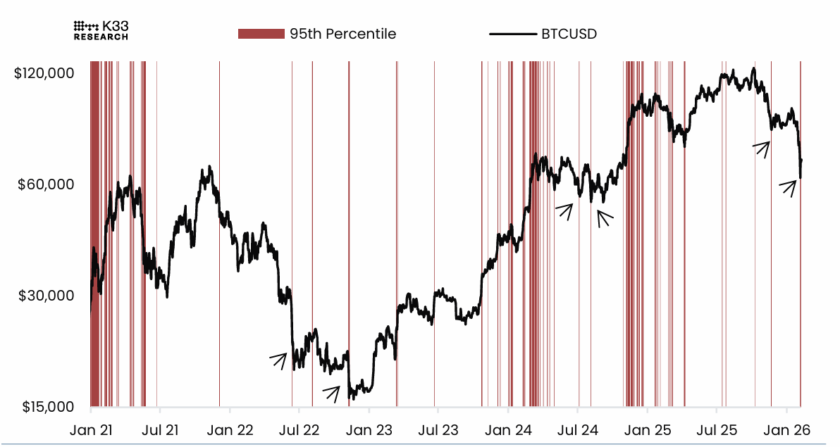 Laporan K33 menjelaskan bahwa lonjakan volume terjadi selama ekstrem lokal. Kinerja BTCUSD yang dilapisi dengan hari-hari volume perdagangan persentil ke-95 dibandingkan dengan celah 365 hari yang bergulir, seperti yang ditunjukkan dalam grafik di bawah ini.