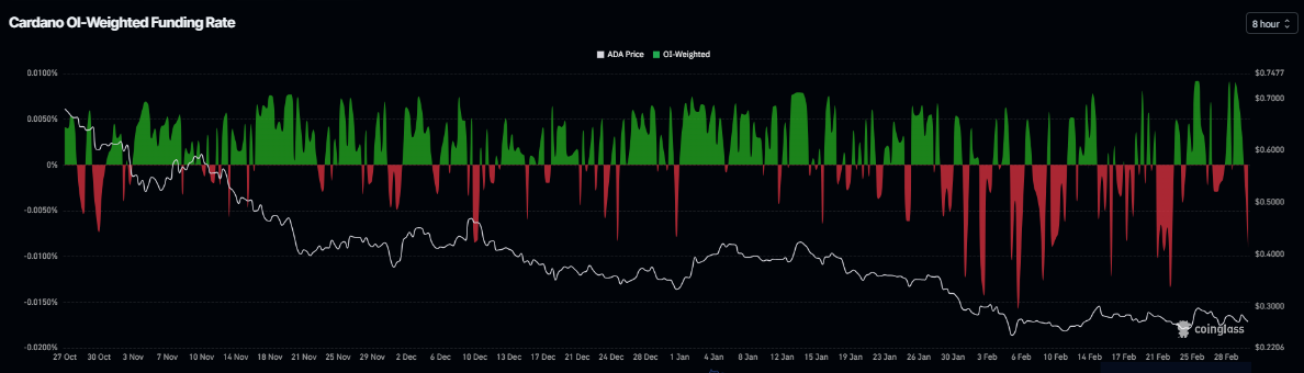 Di sisi derivatif, data tingkat pendanaan CoinGlass juga mendukung prospek bearish. Metrik ini berbalik menjadi tingkat negatif pada hari Senin dan berada di -0,009% pada hari Selasa, menunjukkan bahwa posisi pendek membayar posisi beli, yang menunjukkan sentimen bearish terhadap ADA.
