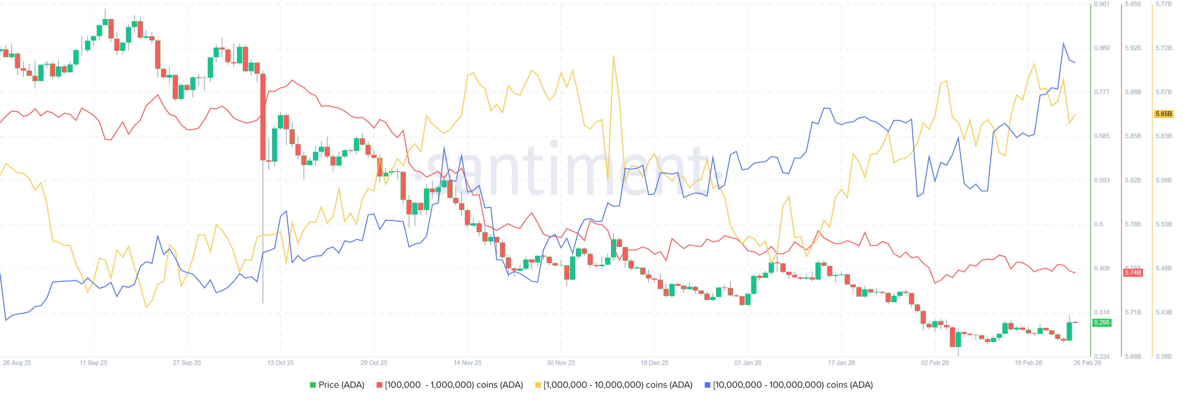 Metrik ini menunjukkan bahwa whales yang memegang antara 1 juta dan 10 juta token ADA (garis kuning) dan mereka yang memegang antara 10 juta dan 100 juta token ADA telah mengakumulasi total 260 juta token dari 14 Februari hingga Kamis. Selama periode yang sama, dompet yang memegang antara 100.000 dan 1 juta token ADA (garis merah) telah melepaskan 20 juta token.