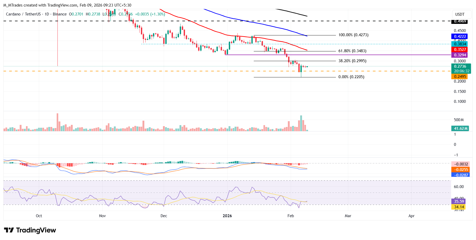 Jika ADA pulih, koin ini dapat melanjutkan pemulihan menuju level Fibonacci retracement 38,2% di $0,29 (ditarik dari puncak 14 Januari di $0,42 dan level terendah hari Jumat di $0,22).