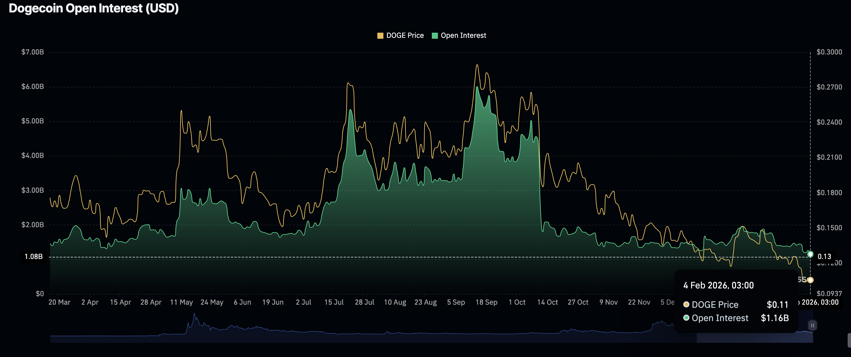 - DOGE menghadapi penurunan signifikan dalam minat ritel, dengan Open Interest menyusut menjadi $1,16 miliar.