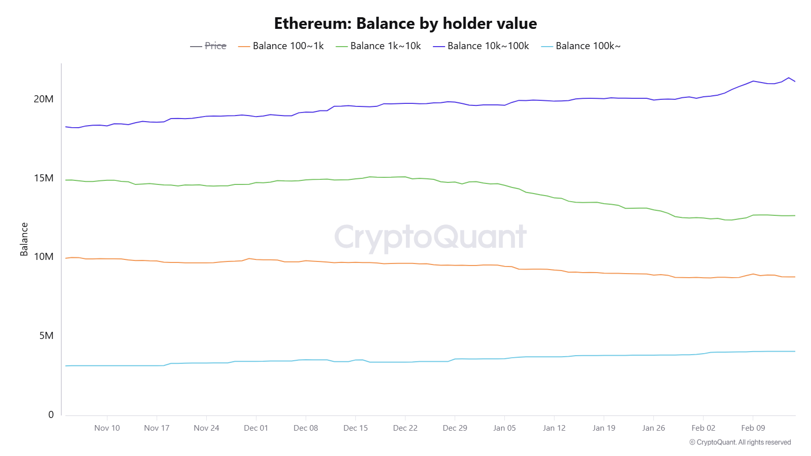 Whales atau dompet yang memegang 10 ribu-100 ribu ETH menghentikan aktivitas pembelian mereka minggu lalu, tetapi akumulasi jangka panjang mereka tetap kuat. Saat penurunan harga ETH semakin cepat, kelompok ini mulai mengakumulasi dan kini telah mengumpulkan 840 ribu ETH sejak 4 Februari.