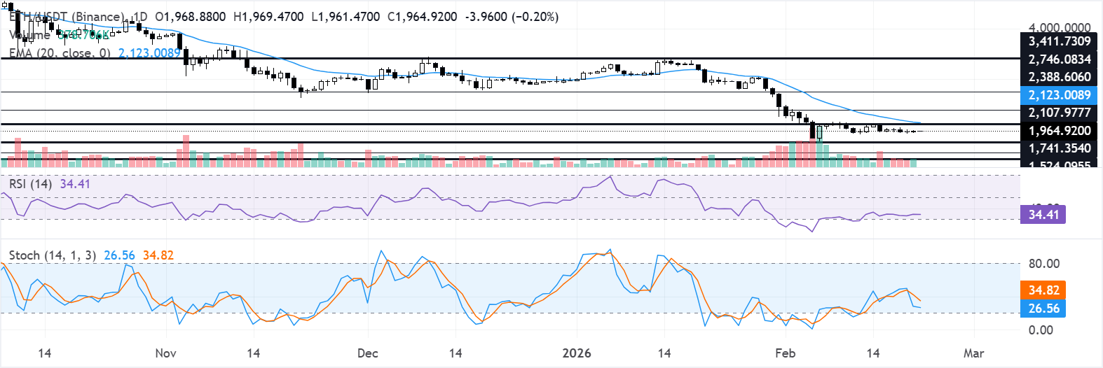 Dalam grafik harian, ETH/USDT diperdagangkan di $1.967. Exponential Moving Average (EMA) 20-hari di $2.123 menurun, membatasi rebound dan memberikan sinyal bias bearish berlaku.