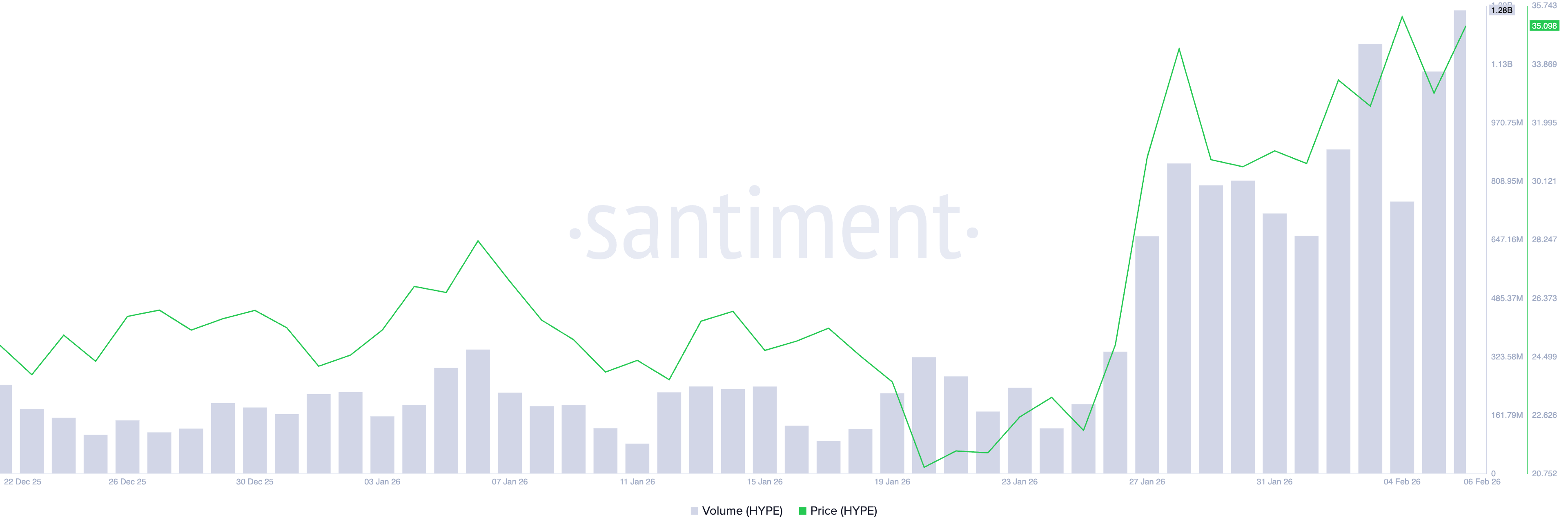 Coinbase mengumumkan pada hari Kamis pencatuman token HYPE dari Hyperliquid, mengalirkan lebih banyak volume perdagangan ke salah satu dari sedikit altcoin yang mempertahankan kenaikan di pasar bearish saat ini. Data Santiment menunjukkan bahwa volume perdagangan HYPE mencapai $1,28 miliar sejauh ini pada hari Jumat, melampaui puncak $1,18 dari hari Selasa.