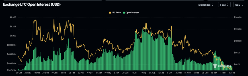 OI futures Litecoin jatuh menjadi $328,60 juta pada hari Selasa, setelah terus menurun sejak pertengahan Januari. Penurunan OI ini mencerminkan berkurangnya partisipasi investor dan memproyeksikan prospek bearish.