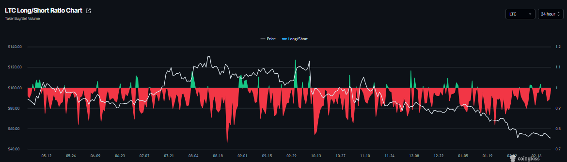 Selain itu, rasio long-to-short Litecoin terbaca 0,94 pada hari Selasa dan telah gagal untuk tetap di atas 1 untuk ketiga kalinya sejauh bulan ini, menandakan bahwa para pedagang enggan untuk menambah posisi beli. Rasio di bawah 1 ini menunjukkan sentimen bearish karena para pedagang bertaruh pada penurunan harga Litecoin.